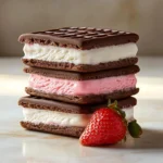 Delightful ice cream sandwiches featuring soft chocolate cookies filled with creamy vanilla and strawberry ice cream.